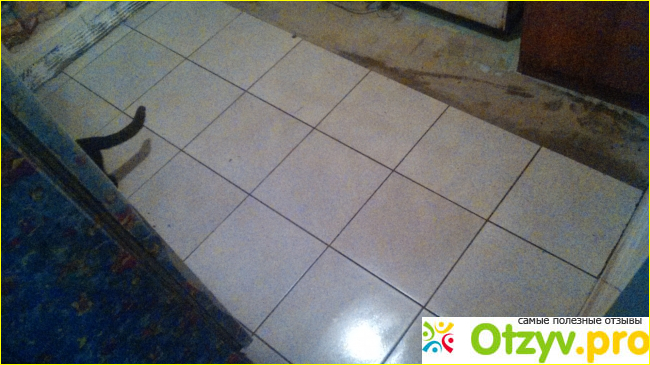 На фото видна та часть, где плитка уже положена, и где ее еще нет. Гипсокартон я прикручивал к деревянному полу саморезами, предварительно нанеся на пол плиточный клей с помощью гребенки. Клей я нанес для того, чтобы компенсировать неровности пола. Грубо говоря, чтобы гипсокартон не ломался в области изгибов досок. Естественно, уровень я не старался ловить. Он здесь никому не нужен.