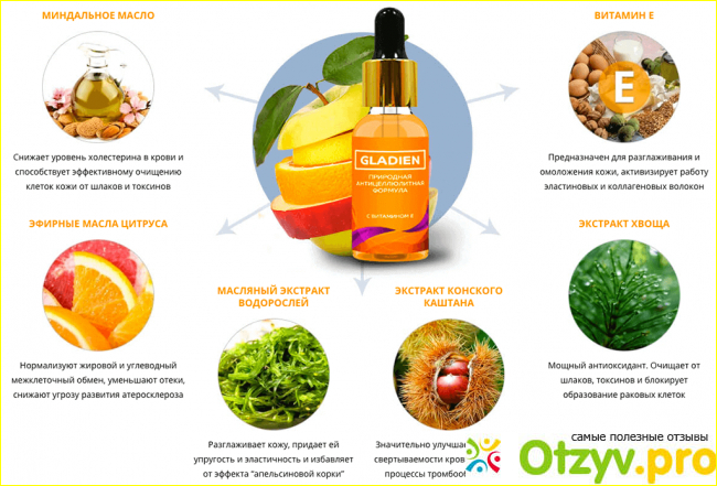 В составе Gladien полезные экстракты и масла, которые влияют на сосуды, лимфодренаж и сжигание жиров. Они помогают коже полностью обновиться и налаживают в ней обменные процессы.