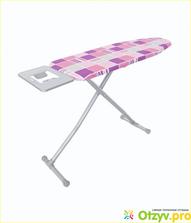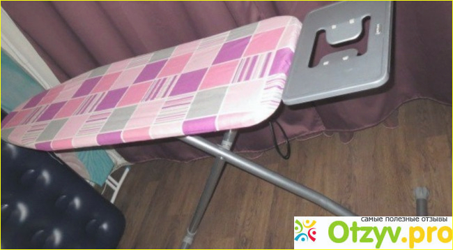 На данной модели имеется регулировка по высоте, ткань на доске не линяет. Очень просто складывается и самое главное не занимает много места. Стоит она довольно крепко, не шатается. Болт металлический который соединяет ножки. Порадовала ширина поверхности 125 на 42 сантиметра. Чехол доски сделан из антипригарной ткани, имеется прочная подставка для утюга, всё надёжно и крепко держится. Так же на подставке расположена розетка что очень удобно, длина шнура полтора метра. Изготовлена гладильная доска в Турции. У меня лично шнур от утюга ни за что не цепляется. Вообще я довольно данной доской, гладить на ней превосходно, удобная как при использовании так при складывании, занимает мало место.