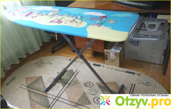Ножки регулируются по высоте, самой максимальной является 900 мм. Однако я предпочитаю гладить некоторые вещи сидя на диване, доска это тоже позволяет. Выдерживает она около 25 килограмм веса, жена на нее ставит швейную машинку. В общем мы приобретением довольны. Правда, на этикетке сказано, что гарантия у нее всего 5 лет, интересно, а сколько она прослужит на самом деле?