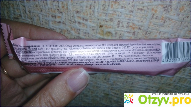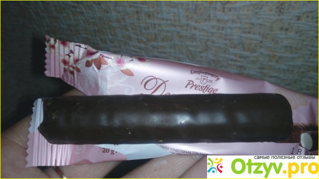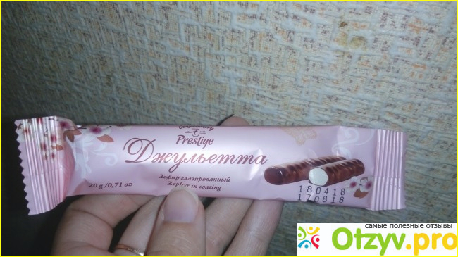 Сверху толстый слой шоколадной глазури. Глазурь вкусненькая, не "пластилиновая". Глазурь не трескается и не осыпается. Внутри лёгкий и воздушный зефир. Зефир с фруктовым вкусом и ароматом, но аромат совсем лёгкий, без резких химических ароматизаторов.