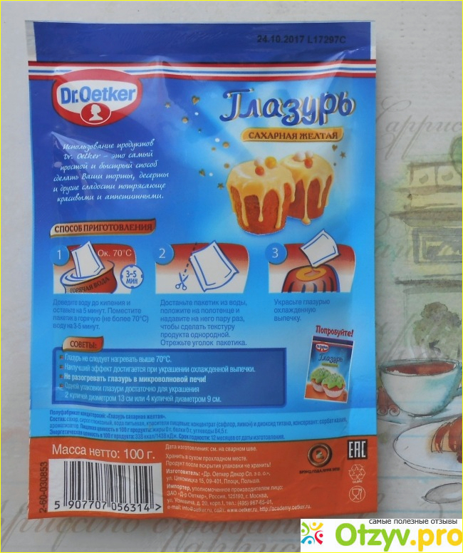 Данный пакет надо, не раскрывая, поместить в горячую, но не выше 70 градусов Цельсия воду на 3-5 минут, а затем отрезать носик и выдавить на верхний слой кондитерского изделия. Глазурь застывает ровным слоем на горизонтальной поверхности и образует красивые потеки по бокам выпечки. Выглядит это очень аппетитно, желтый цвет не яркий, но приятный для глаза. Использованы натуральные красители растительного происхождения - сафлор и лимон. Вкус сладкий, на то она и сахарная глазурь. В составе нет ни жиров, ни белков, одни углеводы. Но если учесть, что глазированный слой получается тонкий, то большого вреда для фигуры от него не будет. Одного пакета, хватает на два кулича или кекса диаметром 13 см или 4 изделия диаметром 9 см. Как написано в инструкции, так и на деле получилось. Это касается и способа приготовления, и расхода. Рекомендую этот продукт быстрого приготовления от Dr.Oetker, чтобы без хлопот создать кондитерский шедевр.