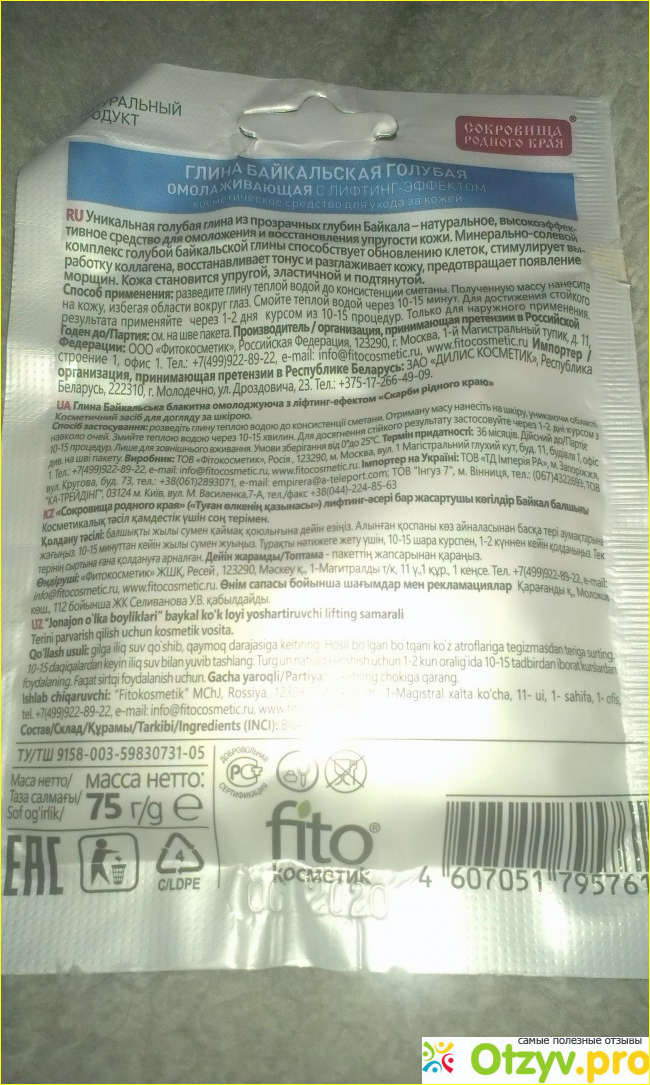 Глина Байкальская голубая находится в пакетике, всего глины для разведения 75 грамм. Это достаточно большое количество. После вскрытия пакета, остатки глины нужно правильно хранить дабы она не скомковалась и не утратила возможности для разведения. Глина боится влаги и воздуха. Производитель нам её рекомендует для любого типа кожи. И заявляет, что от её использования получим эффект омоложения и лифтинга. Обещания заманчивые, но так ли это на самом деле?