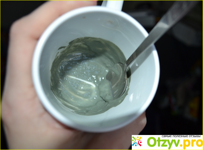 Лучше всего использовать для приготовления широкую небольшую мисочку или чашку. Я беру керамическую. С количеством воды угадать сложно, поэтому поливаю совсем понемногу и все время размешиваю. Должна получится густая жижа, такая чтобы было комфортно наносить на кожу.