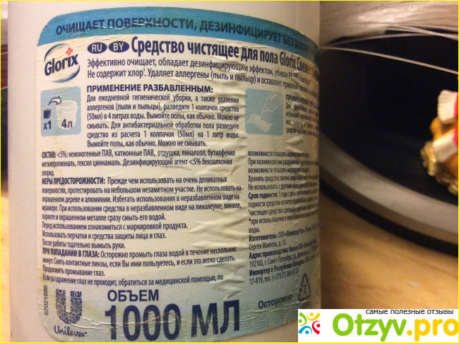 Запах приятный не вызывает аллергии, дезинфицирует поверхность. Когда моешь пол сразу видно результат. При использовании других моющих средств остаются разводы и не каждым средством можно мыть, помимо разводов некоторые материалы просто приходят в негодность. После чистящего средства для пола Glorix не остаётся разводов. Подходит для мытья деревянных поверхностей, линолеума можно мыть ламинат и другие поверхности. После использования чистящего средства для пола Glorix остаётся приятный свежий запах, хорошо убивает бактерии и аллергены. После мытья пола с помощью чистящего средства для пола Glorix не требуется повторного мытья пола. Использовать чистящее средство для пола Glorix можно как в разбавленном виде так и концентрированное если поверхность сильно загрязнённая. Для обычной уборки чистящее средство для мытья пола Glorix разводим таким образом. В ведро наливаем четыре литра воды и добавляем один колпачок чистящего средства. Этого достаточно что бы помыть полы и продезинфицировать. Для более тщательной уборки разводим один колпачок чистящего средства в одном литре воды и моем. Можно также протереть поверхность губкой смоченной в чистящем средстве это в случае сильного загрязнения.