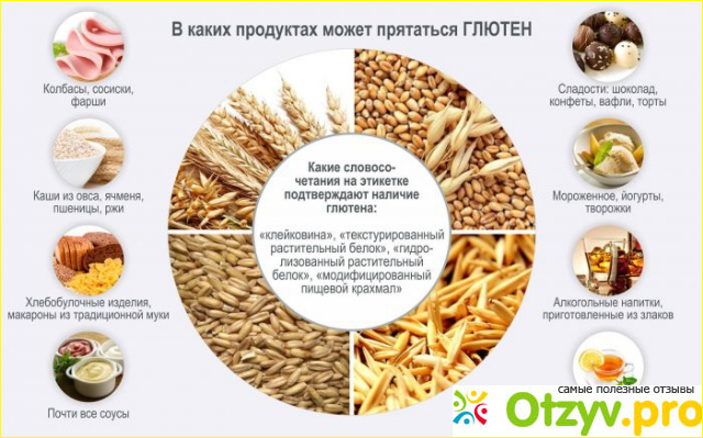 Глютен является растительным белком, который находится в категории продуктов. В их число входят: ячмень, рис, овёс, рожь, шоколад, соусы, колбасные изделия, йогурт и молочные продукты, макароны, перловка, торты, хлопья, кетчуп, заправки. Можно увидеть его в составе некоторых товаров. Он делает их состав эластичной. Обязательно обращайте внимание на компоненты. Пшеница тоже содержит это вредное вещество, но не в тех дозах, которые получаются в хлебе. В хлеб добавляют большое количество порошка с этим компонентом. Врачи советуют употреблять мало мучных изделий, не больше ста пятидесяти граммов каши, есть больше овощей и фруктов.