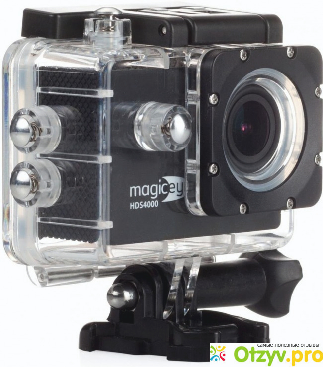 Имеется удобная кнопка смены режимов работы этой камеры. На лицевой стороне камеры рядом с объективом находится крупная кнопка включения, что в принципе странно, но своеобразно вписывается в общий дизайн этой экшен камеры. На задней стороне камеры расположен современный жидкокристаллический дисплей 1.5 дюйма. На верхней части камеры располагается только одна кнопка отвечающая как и во всех стандартных камерах и фотоаппаратах за включение съемки, делает фотоснимок и так же разработчики добавили ей функцию подтверждения выбранной функции в меню, по принципу клавиши enter на клавиатуре компьютеров. С низу камеры Gmini MagicEye HDS4000 располагается место для установления съемного аккумулятора. С лева расположились компактно 2 разьема для микро usd и микро эйч ди емай, так же разьем для карты памяти микро sd. И здесь стоит сказать о своеобразном недостатке который в принципе решен разработчиками но в другом варианте, а недостаток видится в том что эти разьемы ничем не защинены в плане от влаги, но для этого разработчики придумали решение в плане защитного бокса – который так же идет в комплекте с этой экшен камерой. Стоит отдельно отметить что бокс достаточно прочный и качественный в плане водонепроницаемости, как заверяют разработчики – камеру Gmini MagicEye HDS4000 можно опускать на глубину до 30 метров, чего думаю достаточно для многих целей, а как проверяли некоторые энтузиасты, то защитный бокс выдерживает и более глубинные места в море где уже достаточно более сильное давление.