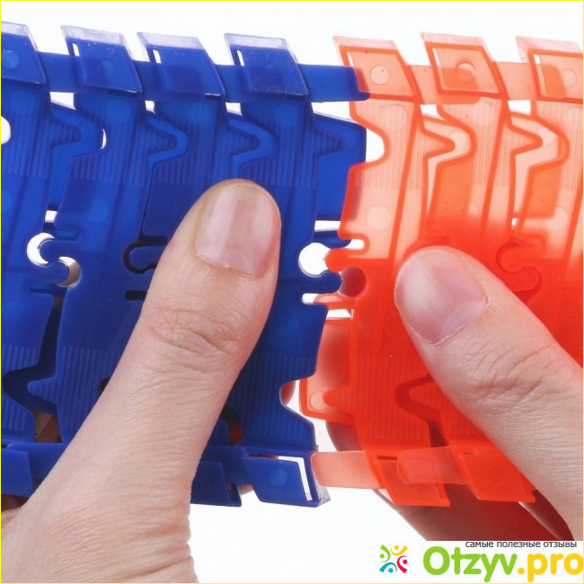 Состоит конструктор из маленьких траков, которое соединяются между собой. При необходимости бракованный или лишний трак можно вообще выкинуть из трассы. Для удобства траки соединены по несколько в «рельсы» разных цветов. Всего в нашем наборе 220 таких траков. Рельсов, конечно, значительно меньше. Цвета траков: