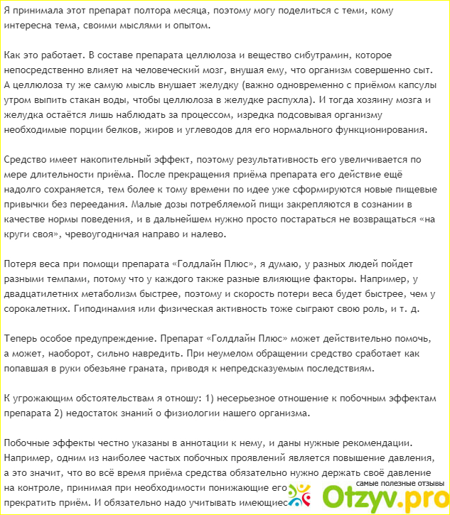 Пила "Голдлайн" шесть месяцев, есть не хотелось, ничего не болело, худела не очень быстро, но хорошо, всё понравилось, с радостью бы продолжила пить его, но увы продают теперь только по рецепту врача.