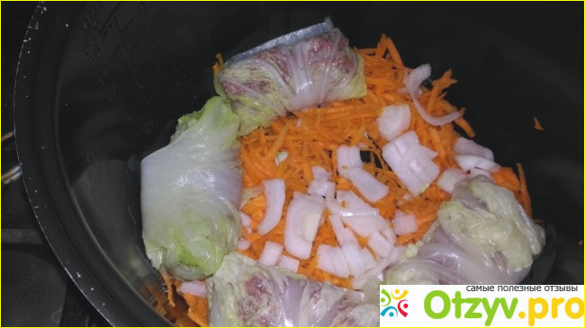 Ну вот, навертела голубцов. Теперь складываю их в мультиварку (можно в кастрюлю), пересыпаю слои тертой морковью и рубленым репчатым луком.