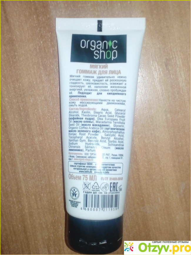 Он содержит в себе органическое масло зеленого кофе, масло лимонника и кофейную пудру.