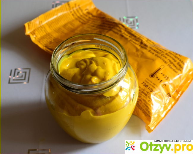 Он насыщенного жёлтого цвета, однородной консистенции. По густоте – как обычный майонез Провансаль.