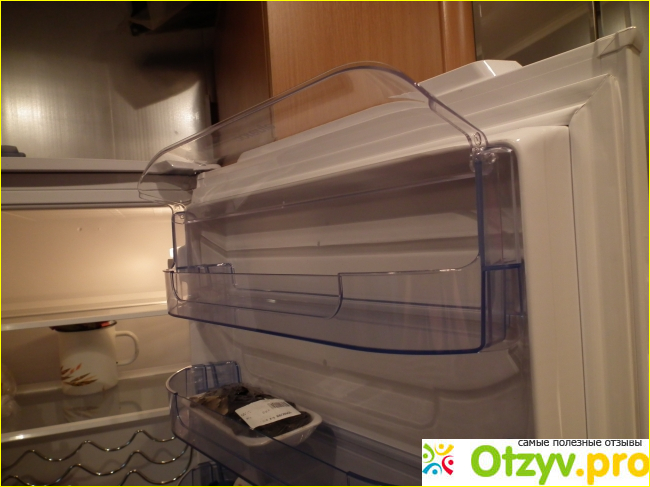 В двери полочки для хранения некрупных продуктов. В нижнюю помещаются бутылки, в те что сверху — различные некрупные продукты.