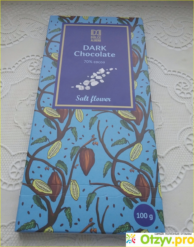 Находясь в гипермаркете "Лента", я обратила внимание на симпатичные плитки горького шоколада с морской солью Dolce Albero. Как раз на шоколад торговой марки Dolce Albero была акция и плитка шоколада стоила всего 99 рублей. Так как у меня сахарный диабет 2 типа и сладкое мне противопоказано, то я все равно купила несколько плиток шоколада с различными вкусами, различным составом и наполнителем, среди которых находился с морской солью.