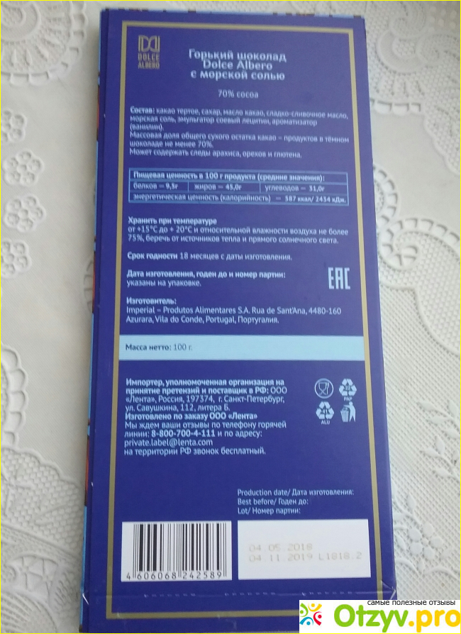 Изготовлен данный горький шоколад в Португалии по заказу ООО "Лента".
