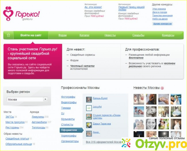Если у вас намечается скоро свадьба, и нужен свадебный фотограф, видео оператор, визажист, парикмахер, то вам непременно стоит заглянуть на этот сайт.Горько. ру- это крупнейшая свадебная социальная сеть, в которой вы найдете все что нужно для подготовки своей свадьбы, как правильно ее организовать, оформить и прочие вопросы. Первое что нужно сделать это пройти не сложную регистрацию на сайте. Затем вы выбираете нужный вам регион в котором вы проживаете, городов в списке много.