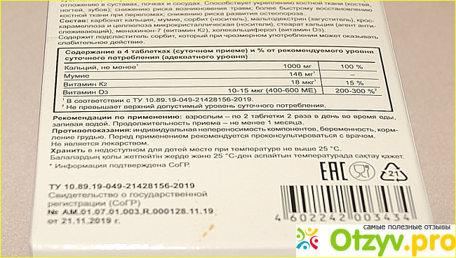 В состав препарата Горный кальций D3 с мумие производителя компании "Эвалар" входят непосредственно кальций, витамин D3, необходимый для его усвоения и высокогорное мумие, в состав которого входят бор, магний, фосфор, железо, кремний, медь, цинк и сера. Все компоненты мумие так же способствуют усвоению кальция и укреплению костной ткани.
