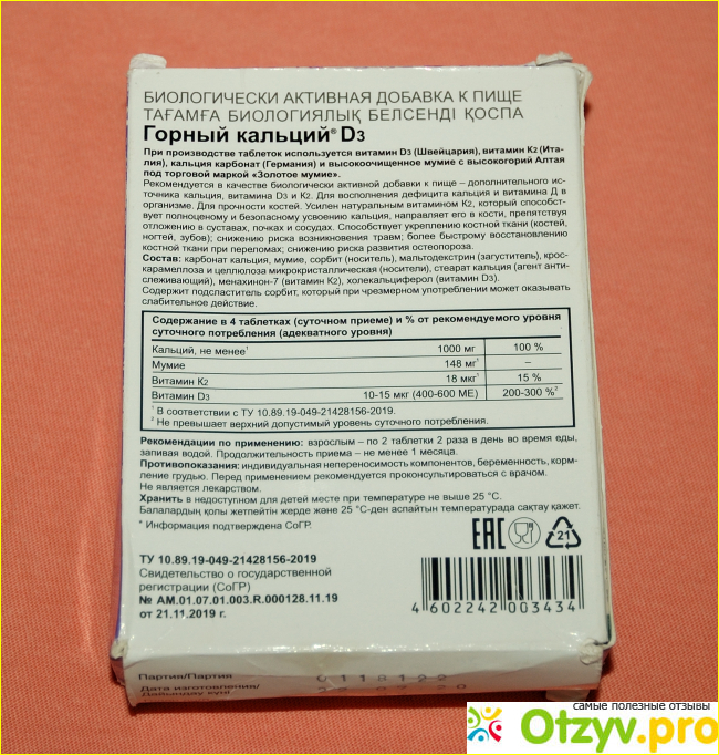 Так же из многочисленных преимуществ такого препарата не редко многие покупатели выделяют и то, что Горный кальций на 100% удовлетворяет суточную потребность организма, во всех микроэлементах и минералах, таких, как в кальции, так и в витамине Д3.