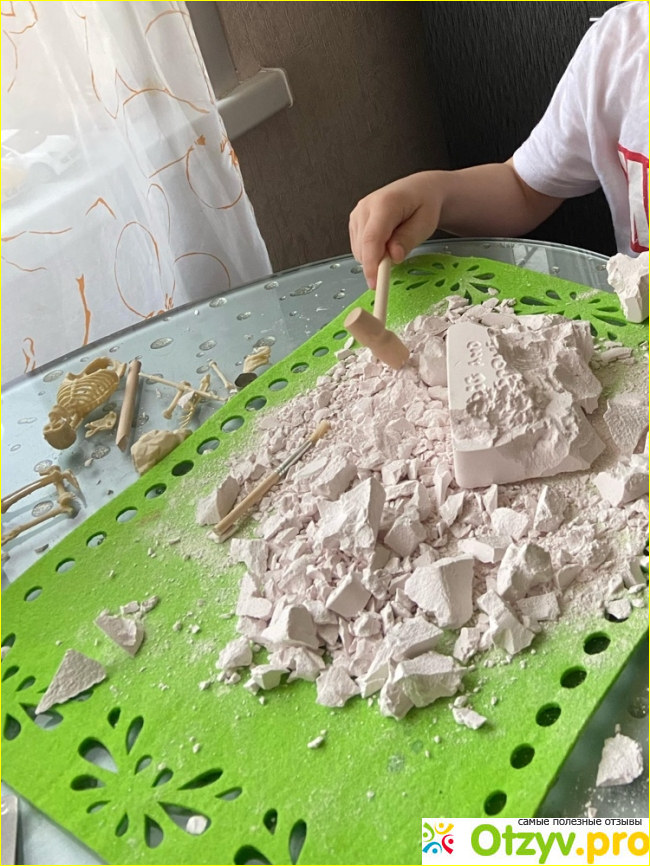 Произволитель ставит возрастные ограничения на упаковке 3+. Это не совсем корректно как я считаю, потому что колоть гипс молотком и палочкой тяжеловато для малышей, кроме того есть небольшой риск травматизма. Чтобы приспособиться совершать удары по гипсу требуется несколько повторений. Моему ребенку шесть лет, и все делалось под строгим контролем, так как все же это не самое простое занятие. Даже немного мочили гипс водой, чтобы легче колоть. Чтобы по квартире разлеталось меньше мусора, я подстилала газеты.
