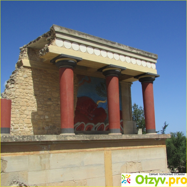Кстати, сам Кносский дворец расположен совсем рядом с Ираклионом, до него легко добраться на городском автобусе №2, который идет в Кносс от автовокзала Ираклиона. Время в пути составляет приблизительно 15 минут, цена билета 1,5 евро в киоске на остановке и 2,5 у водителя. Стоимость входных билетов для взрослых 6 евро. В сезон может быть очередь на вход. Дворец посмотреть, думаю, стоит, несмотря на то, что подлинных росписей там нет, но копии позволяют получить представление об этом необычном сооружении. Интересно посмотреть расположение помещений, а по возможности послушать экскурсовода (предложений очень много, можно найти экскурсию у самого входа в музей).