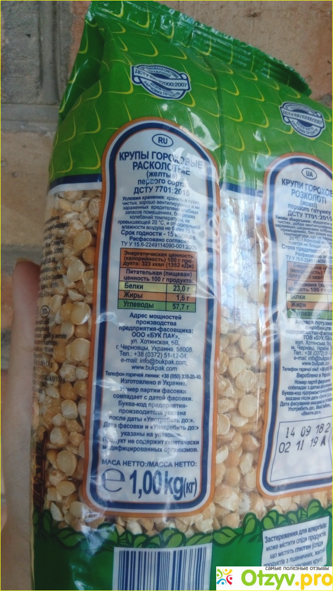 На обороте упаковки указаны контактные данные производителя, состав, способ приготовления, энергетическая ценность, а также сроки годности гороха.