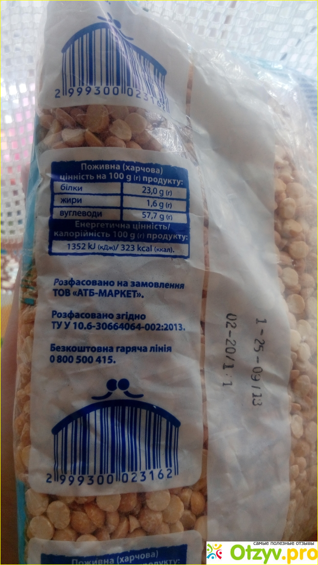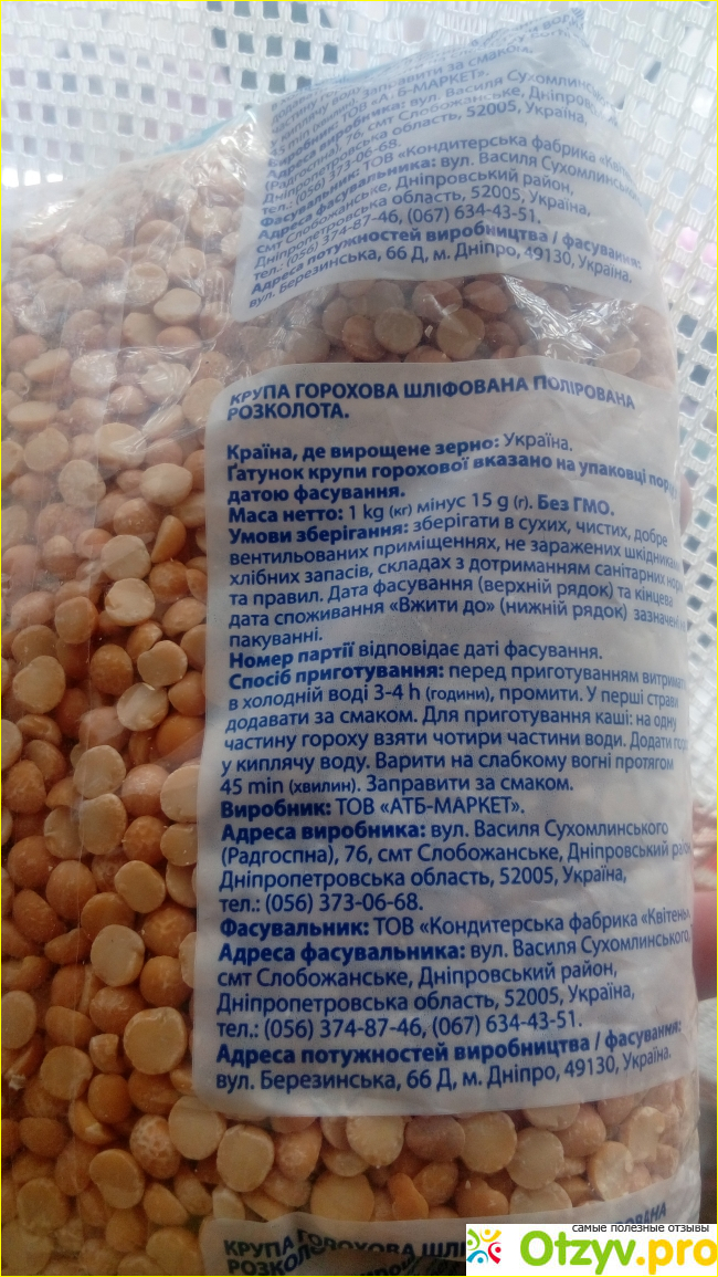 На упаковке производитель указывает способ приготовления гороха, его энергетическую ценность и контакты предприятия производителя.