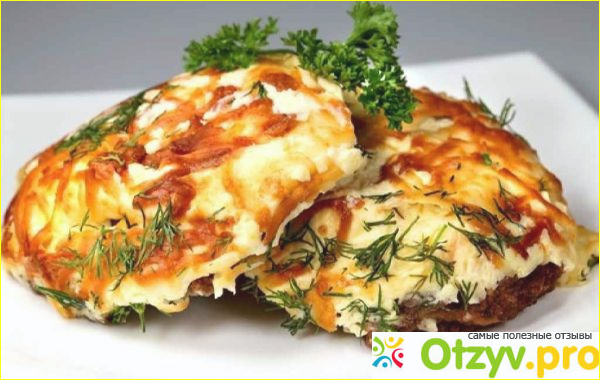 На противень выложить наши куски мяса, сверху равномерно распределить начинку и посыпать сыром. Запекать в духовке примерно 15-20 минут. При подаче на стол украсить резаным укропом. Для гарнира идеально подойдет картофельное пюре. Приятного аппетита!