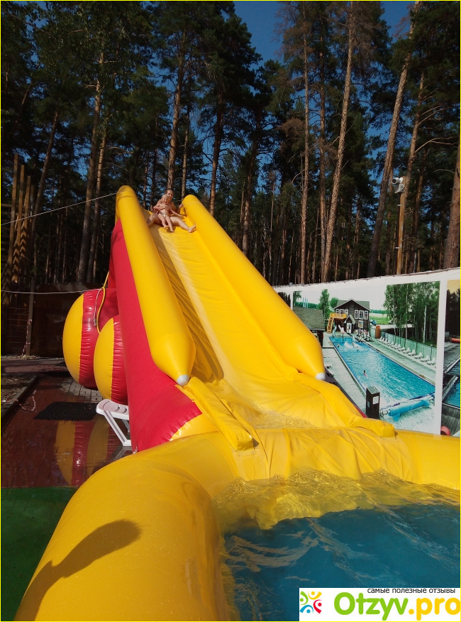 Также на улице есть баня, с огромными окнами и видами на источники и ресторан, который расположен недалеко от комплекса. Летом для тетей надули резиновую горку. Зимой она отсутствует.