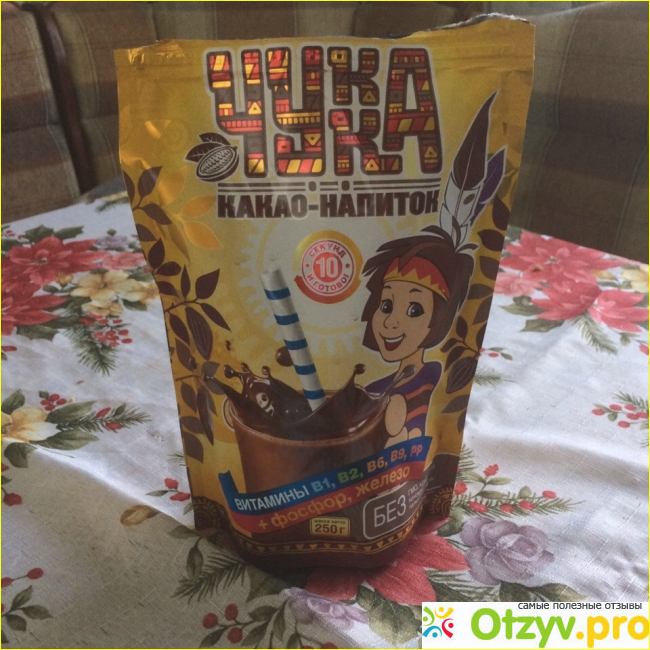 На упаковке нарисован стакан с какао и веселый мальчик.