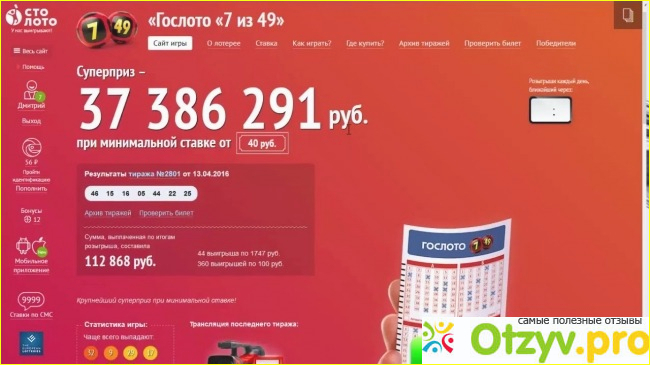 А еще если человек угадывает из этого числа диапазона комбинации минимум от 3цифр, то получает приз в сумме 125 рублей. А если угадает разом все 7 цифр, что будет просто бомба и мистика, то выиграет один из суперпризов государственной лотереи. А суперприз, который обещает сайт составляет 10 000 000рублей. Вот интересно реальность это или все таки развод, ну хоть быть бы 125рублей выиграть, наверное многим было бы за радость. Что не зря денежные средства потратил.