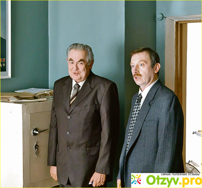 Задумка интересная, надо отметить, и воплощение ее в реальность на довольно-таки неплохом уровне. Плюс актёрский состав порадовал, в особенности Юрий Стоянов, исполняющий главную роль. Его персонаж получился очень трогательным, интеллигентным и в хорошем смысле слова - забавным. Ниже кадр, где Стоянов изображает Брежнева, пытаясь спасти Кристину и Сергея из неприятной ситуации. Получилось по-настоящему смешно. Михаил Трухин тоже неплох. Не соглашусь с другими комментаторами, что он переигрывает.