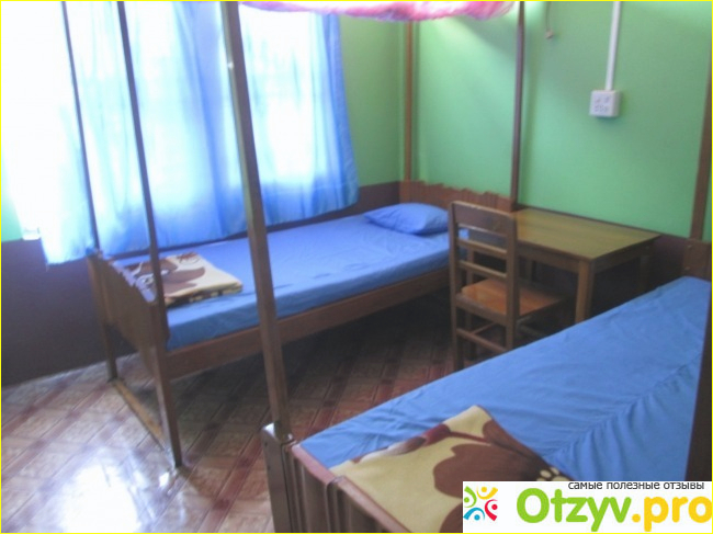 Так выглядит комната на двоих, 14$ стоит. Стол, стул, кровать с противомоскитной сеткой, вентилятор и розетка, урна. Туалет и душ на этаже. Помимо этого есть комнаты с туалетом и душем, но они дороже, цену не узнавал.