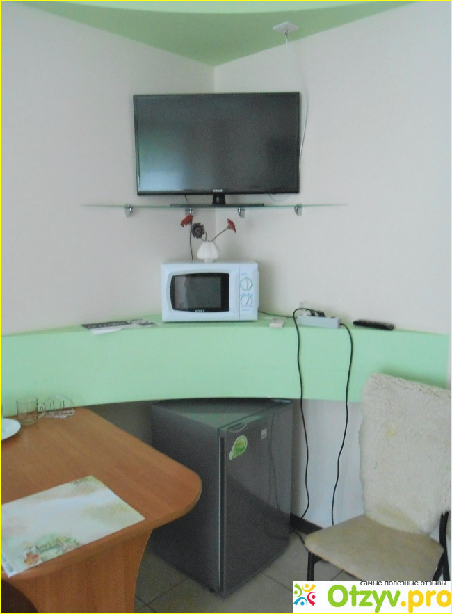 Что касается техники, то в номере присутствовали кондиционер, маленький холодильник, телевизор и микроволновка. Достаточное количество розеток. Электрический чайник и гладильная доска - в общем пользовании на все номера. Wi-Fi в этой гостинице нет, и это действительно существенный минус.