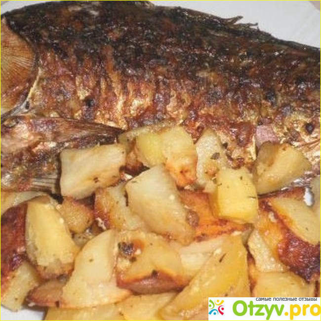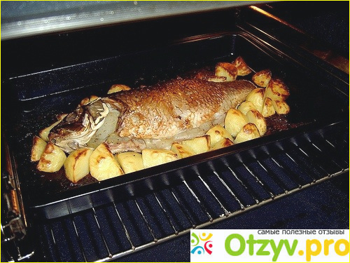 Противень с карасем и картофелем помещаем в духовой шкаф и запекаем минут 30-45, в зависимости от скорости вашей духовки, нам нужен золотистый цвет – корочка как только появилась такого цвета, то можно вынимать смело наше блюдо и предлагать его гостям. Аромат по кухне будет стоять очень приятный, а о вкусе и говорить трудно – уже слюнка накатывается.