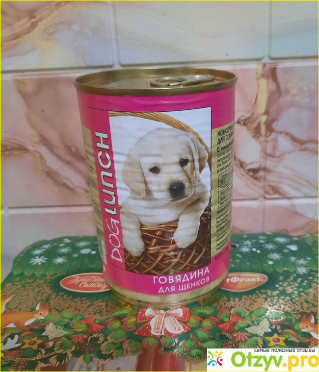 Мы кормим ее готовым кормом, смешивая его с гречневой или рисовой кашей в соотношении 1:1. Недавно попробовали по совету продавца в зоомагазине такой корм - консервы мясные тушеные для собак с говядиной марки ДОГ ЛАНЧ. Вот так выглядит банка, открывается легко