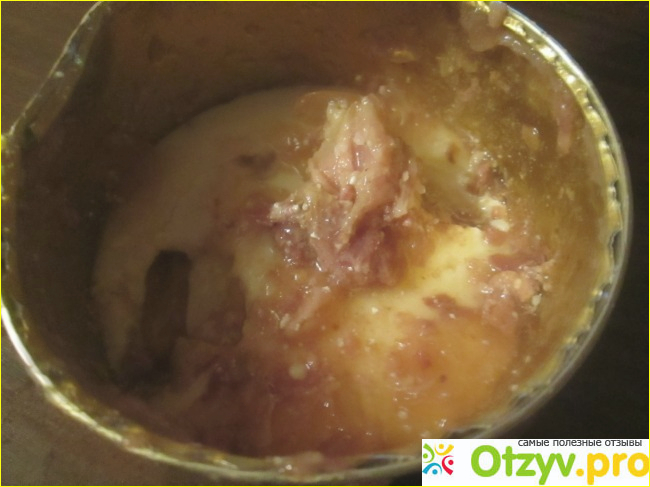 Открыл банку, содержимое, сверху бело-розовых цветов, жирок там и бульон