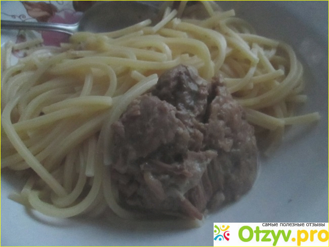 Кусочек мяса с макаронами, есть можно, мясо нормальное.