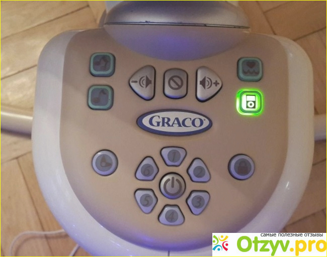 Это пульт управления, есть кнопки классической музыки (4 медленные и 4 быстрыхмелодий), а так же звуки природы и биение материнского сердца. Громкость музыки и звуков можно регулировать, но как мне показалось, что звук очень тихий и на максимальной громкости. Помимо этого есть разъем для подключения mp3 или телефона, можно накачать детские песенки и воспроизвести с помощью укачивающего центра, только в этом случаион будет работать, как колонка. Так же есть кнопка блока от детей в режиме качания.