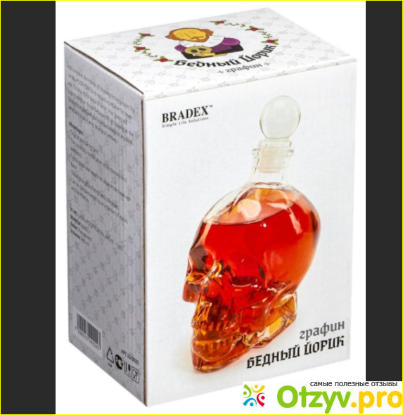 Графин bradex бедный йорик у нас стал интерьерным украшением и способом сохранения алкогольного напитка на долгое время. Ну и, конечно, муж тешит себя наблюдая, как его друзья, великовозрастные мужчины, удивляются увидев такой графин.