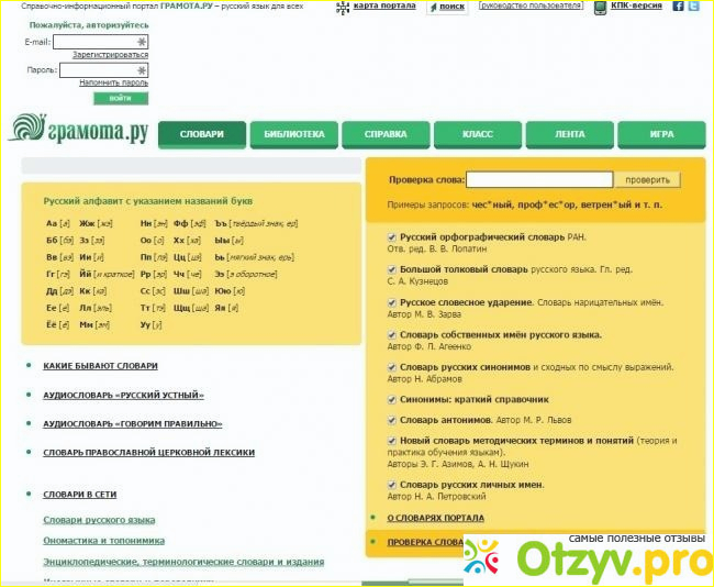 Я не редко пользуюсь услугами словарей, сайтов, где проверяют пунктуацию и орфографию. Одним из таких сайтов является «Грамота. ру». Очень хороший сайт для тех кто сомневается в написании того или иного слова. Я частенько туда заглядываю. Этот сайт является одним из многих помощников в моей работе. И это очень хороший помощник. Если забыл или сомневаешься, как пишется слово, вводишь его в строку поиска, нажимаешь поиск, и мгновенно выдается ответ. Как пишется слово, куда ставить ударение. В каких словарях оно упоминается и что обозначает. На этом сайте можно получить оперативную профессиональную помощь по любым вопросам, связанным с русским языком. Постоянно проводится ряд множества мероприятий для пользователей сайта (олимпиады, конкурсы, викторины, интеренет-конференции). Язык можно изучать через игру. На сайте представлено несколько интересных игр на выбор, а так же головоломки и загадки.