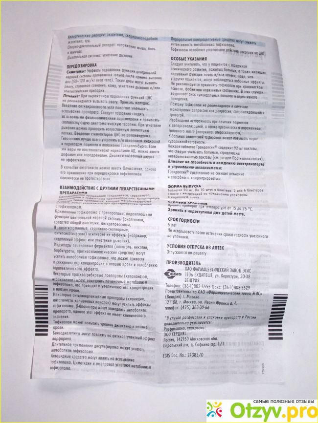 Грандаксин производится в Венгрии, в упаковке 60 таблеток (по 50 мг. тофизопама в каждой, срок годности пять лет и стоимость - 860 рублей за упаковку.