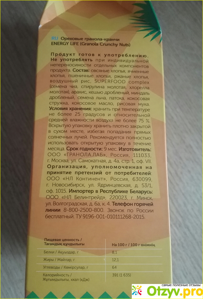 На обратной стороне упаковки указано, что в составе продукта содержится 12 различных витаминов (Е, К, С, РР, А и комплекс витаминов группы В), находящихся в ягодах и фруктах и необходимых для жизнедеятельности человека, высокое содержание клетчатки, 12 минералов, в которые входят: кальций, магний, железо, калий, фосфор, медь, натрий, цинк, марганец, йод, селен, 17 аминокислот растительного происхождения, Омега 3, Омега 6, Омега 9. Кроме того, в составе продукта содержатся дробленные орехи кешью, миндаль, арахис и семена льна.
