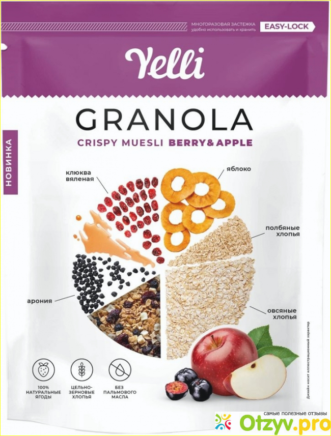 Все дело в граноле Yelli Berry&Apple. Гранола очень аппетитно выглядит, подрумяненные хлопья, с ягодами клюква и арония, плюс яблоко. Ингредиенты не отсыревшие, хрустящие, гранола рассыпчатая, без посторонних примесей и запахов.