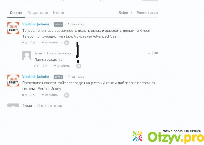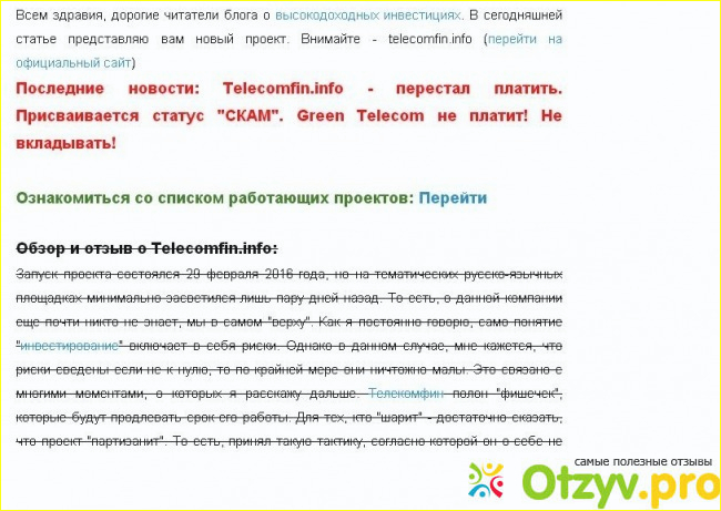 Вот прям как таковых негативных отзывов нет, люди копошились, писали как им работается с Green Telecom (Telecomfin.info), но при этом как бы вскользь упоминают, что «мы молока не видали пока», как бэ деньги вложены, но прибыли нету, а потом и вовсе робко стали говорить о том, что проект закрылся. До свидания, лохотрончик!!!