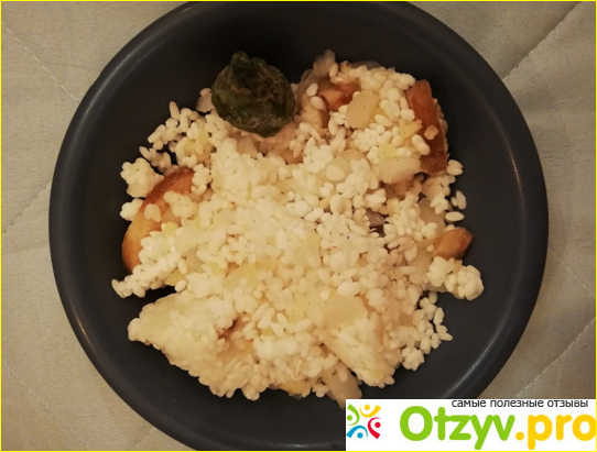 Вижу рис, какой-то толстый и белый (небось, он от вина так), что-то похожее на грибы и большую зеленую блямбу. Что это такое я не поняла, вроде, зелени в составе не заявлено. Может, позеленевший гриб?