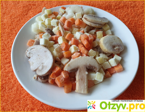 Нет льда, одни овощи и грибы. Нарезка мне подходит, единственное, что встречаются иногда слишком крупные шампиньоны. Для ребенка это не совсем удобно, поэтому я разрезаю кусочки еще пополам.