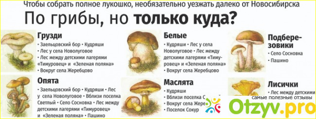 Я помню, как ребенком я с большим удовольствием ездила за грибами с дедушкой. В ту пору я собирала практически все грибы, просто наслаждаясь их красотой. Потом мы их сортировали и оставляли только съедобные. Это было в Новосибирске. Здесь очень много грибных мест и каждую осень я стараюсь не нарушать старой традиции и отправляюсь на грибную охоту с любимым дедулькой. Грибные места в каждом населенном пункте давно исхожены и известны заядлым грибникам, которые из года в год возвращаются на старые места, чтобы собрать грибочков для соления и жарки.