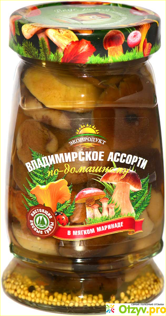 Я часто беру Грибы маринованное Владимирское ассорти по-домашнему от Экопродукт. Чаще всего нахожу в продаже в гипермаркете магнит. В баночке 340 граммов. Цена около 200 рублей, по акции можно взять дешевле. Продукт в мягком маринаде. В прозрачнгой баночке удается рассмотреть внешний вид грибов. Состав довольно богатый: осенние опята, маслята, лисички, белые грибы. В маринаде использованы зерна горчицы, сахар, соль, уксус, небольшое количество трав.