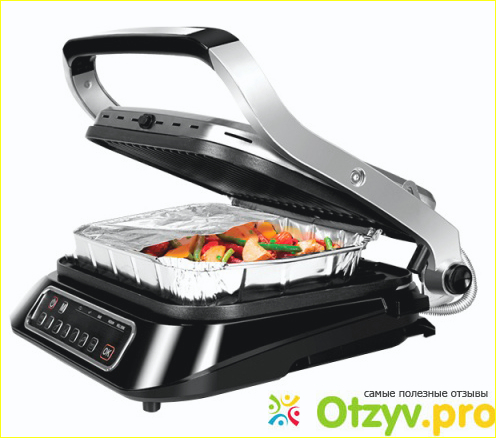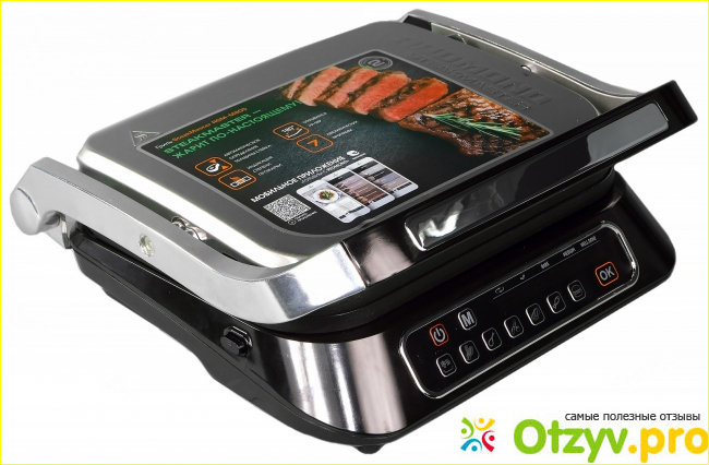 Самая главная отличительная особенность поднимающаяся крышка. Она откидывается не только в сторону, но и вверх, не меняя угла наклона, а еще ее можно разложить так, что получатся две больших жарочных поверхности.
