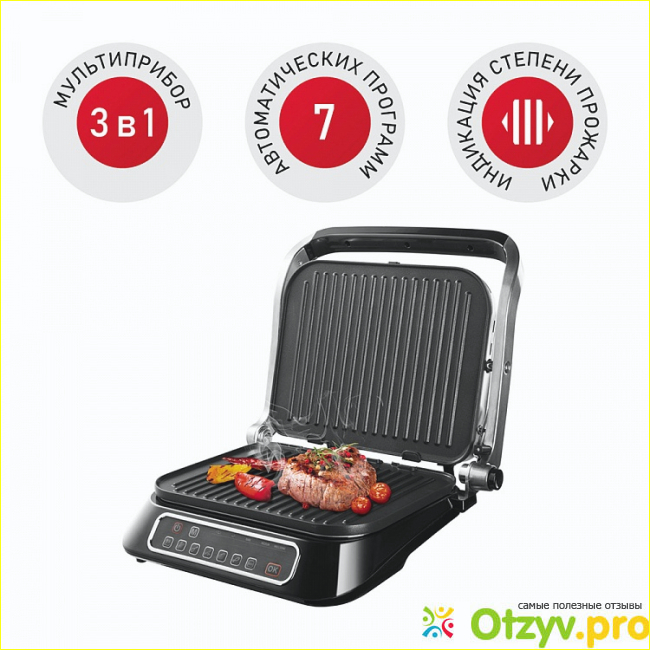 Я кладу на панель продукт, выбираю специальную программу, гриль сам настраивает все параметры готовки, а потом готовит. В процессе показывается индикация прожарки, поэтому завершить процесс удается вовремя. В итоге, у меня получается отлично прожаренное блюдо. Использую книгу рецептов, чтобы готовить необычные и редкие блюда. Плюс он еще 3 в 1. Разворачиваю обе панели, и жарю на них много продуктов. или же запекаю в одноразовом противне. Получается вкусно и быстро.